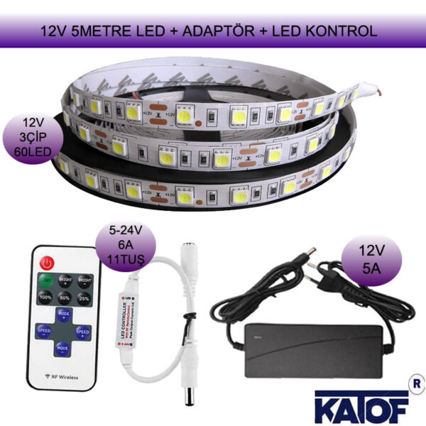 12V 3Çip Tek Renk Şerit Led + Adaptör + Kontrol Kumandası Seti