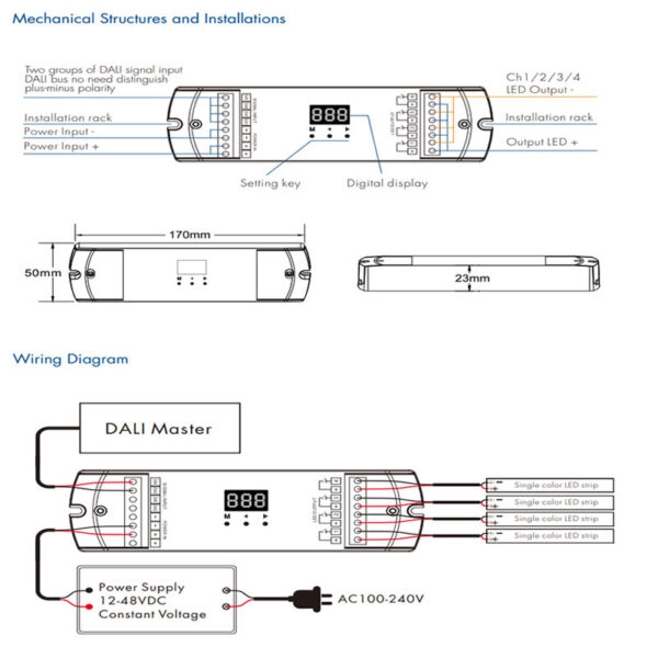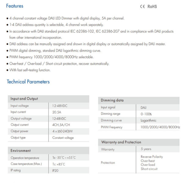 - DA4-L’de 4 ayrı çıkış kanalı vardır ve her kanal 5 A akım kapasitesine sahiptir. Böylece aynı anda dört ayrı LED grubu veya bölümü ayrı ayrı kontrol edilebilir.