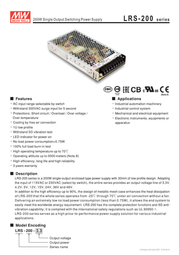 - Marka / Seri : Mean Well, LRS-200 serisi